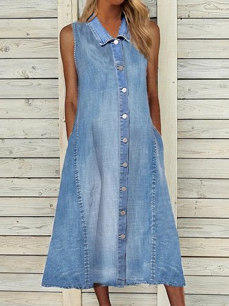 Women's Sleeveless Summer Sky Blue Solid Shawl Collar Daily Outing Casual Midi A-Line Slim Flared Skirt Dress