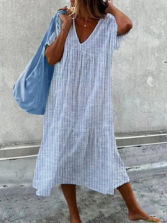 Women's Short Sleeve Summer Black Striped Split Joint V Neck Daily Going Out Vintage Maxi A-Line T-Shirt Dress Dress