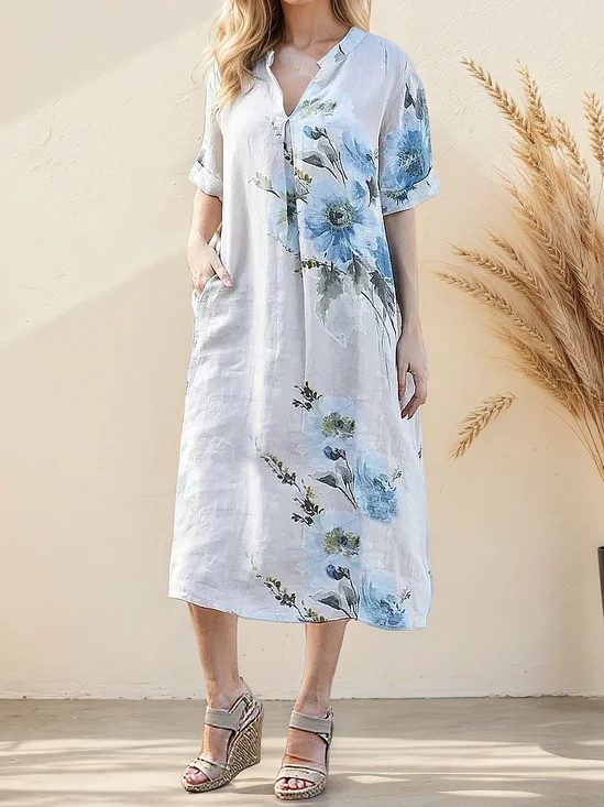 Solid Color Single-Breasted Mid-Length Short-Sleeved Loose Casual Commuter Dress