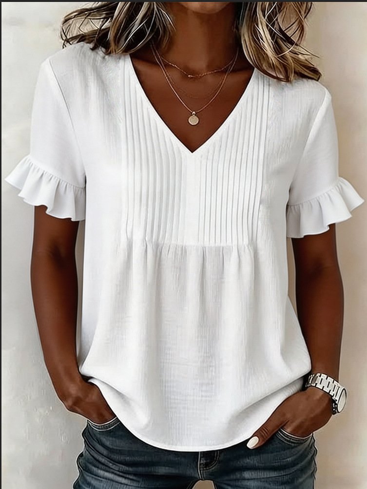 Vacation Plain V Neck Ruffle Sleeve Linen Blend Shirt