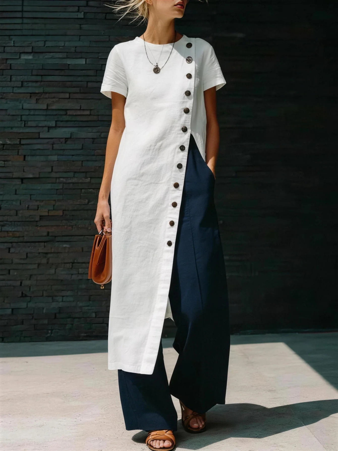 Women's H-Shaped Side Buttoned Slit Long T-shirt With Asymmetrical Slit Long Top
