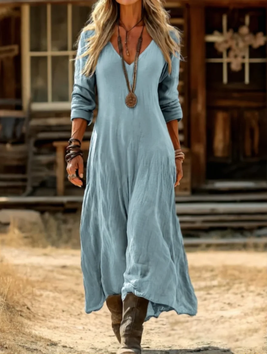 Women's Long Sleeve Spring/Fall Khaki Plain Printing V Neck Daily Going Out Vintage Maxi H-Line Dress